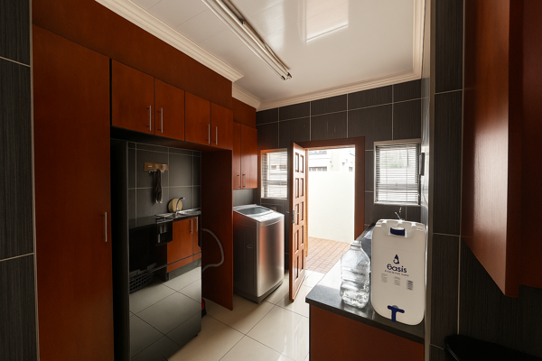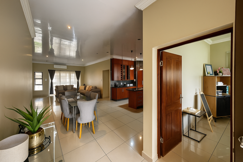 Inside, the open-plan layout creates a natural flow between the dining and living areas, enhanced by air-conditioning for year-round comfort. The modern kitchen comes equipped with a gas stove, electric oven, and a separate scullery with space for a double-door fridge and two appliances, catering to both convenience and practicality. A dedicated study adds the perfect touch for those working from home or needing extra space for productivity.