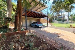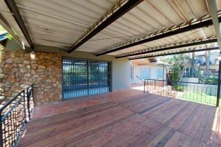 At the back nature rules with rock walls and rock stairwells leading to a covered entertainment area with built-in seating and built-in braai for entertainment.