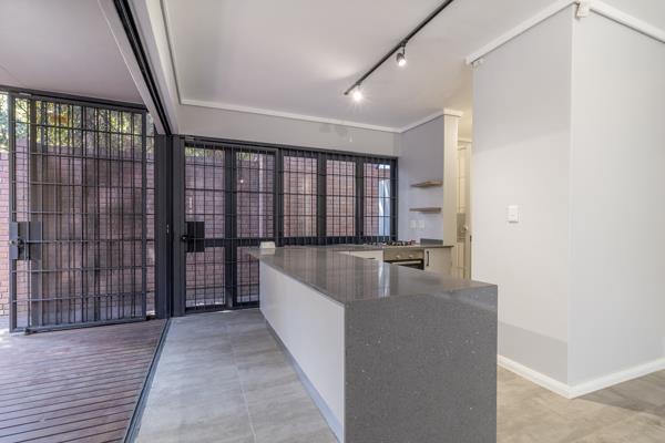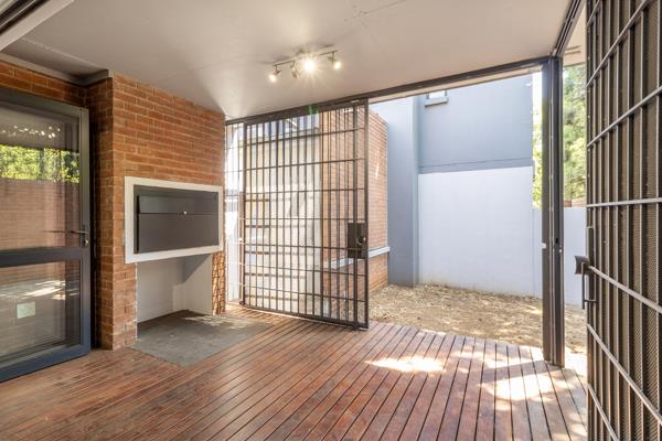 The 8-panel concertina doors open up the entire patio, seamlessly blending indoor elegance with a fully covered patio featuring a built-in braai and overlooking a small private garden, complemented by a guest toilet for effortless entertaining.