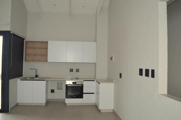 Discover modern living in this stylish 1-bedroom, 1-bathroom apartment available for rent in Baileys Muckleneuk, Pretoria. Spanning 44 square meters, this contemporary unit is designed for comfort and convenience. The open-plan layout seamlessly connects the lounge, dining area, and a sleek kitchen, which boasts white cabinetry, light countertops, and an integrated oven. High vaulted ceilings with exposed beams and painted brick walls add architectural character, complemented by durable tiled flooring throughout.