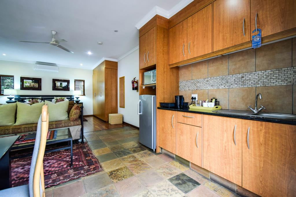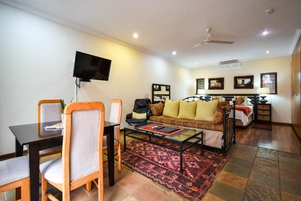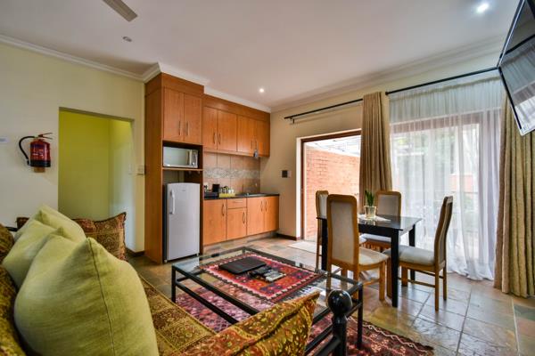 This furnished studio apartment offers a comfortable and convenient living space. The open-plan layout features a combined living and sleeping area with a sofa, queen-sized bed, and wall-mounted TV a compact, equipped kitchenette includes a microwave and fridge, while ample built-in wardrobe storage is provided.