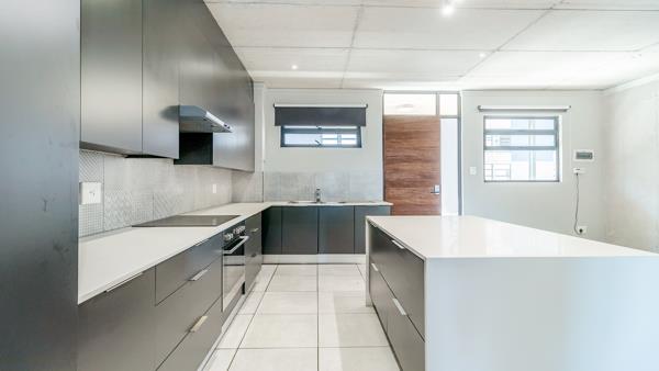 Step into an open-plan kitchen and living area designed for modern living. The kitchen features a center island with storage on one side and a breakfast nook on the other. It includes a double sink, ample countertop and storage space, a fridge nook, and connections for a dishwasher. The hallway offers discreet cupboards that hide connections for a washing machine and tumble dryer.