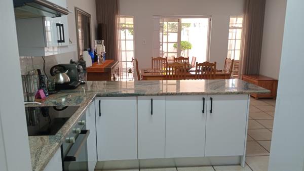 Step inside to an interior designed for both opulent entertaining and serene daily living. The heart of this home is its magnificent open-concept layout, where the contemporary kitchen effortlessly transitions into the dining and lounge areas, bathed in an abundance of natural light streaming through expansive windows and glass doors. The gourmet kitchen is a culinary dream, boasting sleek white cabinetry, sophisticated granite countertops, and a suite of integrated appliances, including an oven, hob, and extractor fan. A dedicated, yet discreet, area within the kitchen accommodates laundry machines, ensuring utmost convenience. The durable tiled flooring throughout these communal spaces not only adds to the aesthetic appeal but also promises effortless maintenance, while direct access to the outdoor area extends the living experience.