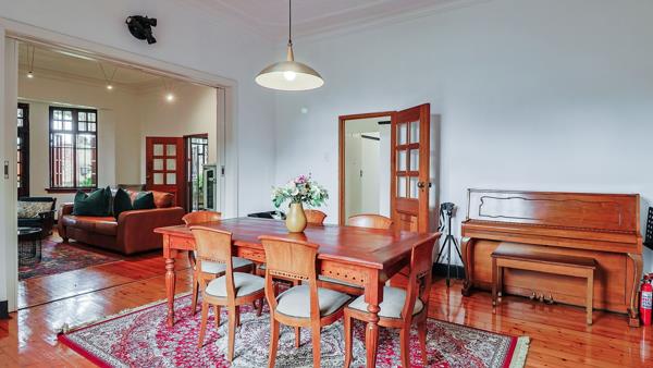 Grand lounge & formal dining room with preserved wooden flooring