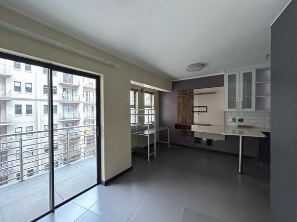 The living area includes a study area and the bedroom area is large enough for a double bed. The kitchen offers ample cupboard space for storage and can house a large fridge as well as a dishwasher or washing machine.