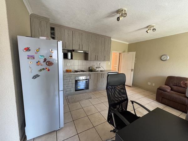 This contemporary two-bedroom, one-bathroom apartment, 55 square metres, offers a refined living experience in the vibrant Hatfield precinct of Pretoria. The meticulously designed interior features an open-plan layout, seamlessly integrating the living area with a modern kitchen. The kitchen is appointed with sleek grey and wood-look cabinetry, an integrated oven and hob, and dedicated plumbing for a washing machine, ensuring both aesthetic appeal and practical functionality. Tiled flooring extends throughout the residence, providing a cohesive and easily maintainable finish. The living space benefits from abundant natural light, with glass doors that may lead to a compact balcony, enhancing the sense of openness.