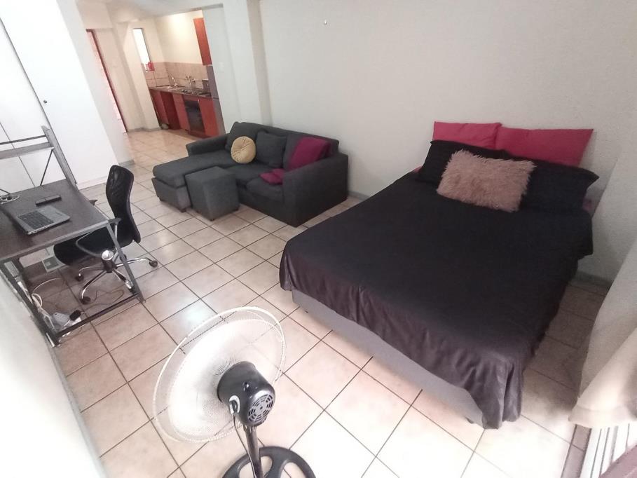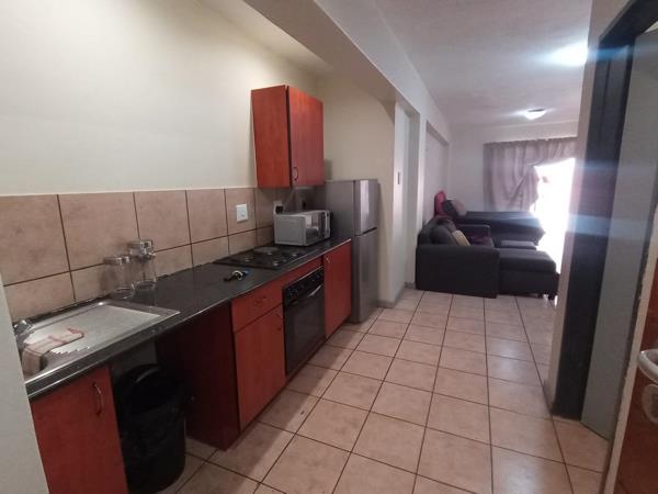 This apartment is on the ground floor and has neatly tiled patio. The kitchen has granite tops and plenty of cupboard space. The open plan bedroom area is spacious and neatly tiled, and the bathroom has a shower, toilet and basin.