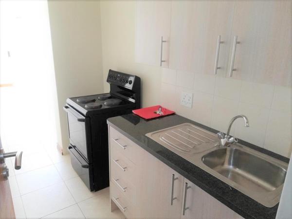 This unit has a full small kitchen with a stove-oven, built-in cupboards, granite tops and space for a fridge.