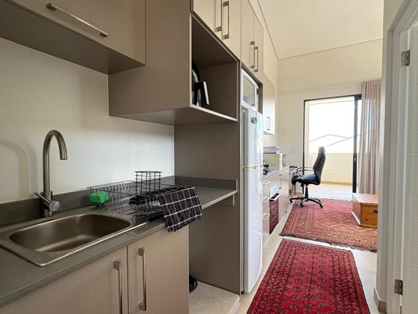 The generously sized bedroom captures plenty of natural light and includes built-in cupboards, as well as space for an additional appliance if needed. A stylish, well-appointed bathroom complete with a shower complements the homes overall
