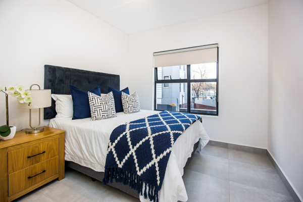 The two bedrooms offer ample cupboard space and are complemented by two modern bathrooms. The main bedroom includes a full en-suite with both a bath and a shower.