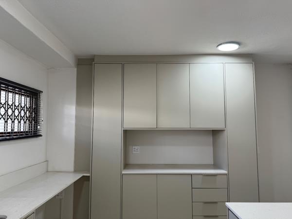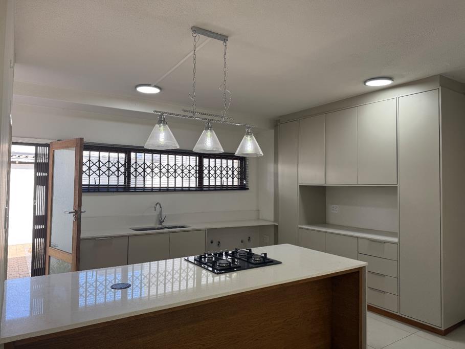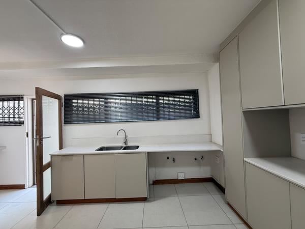 Magnificent sliding doors open to a lush garden filled with trees, providing a serene and private outdoor sanctuary. The garden also features a built-in braai, ideal for entertaining and outdoor dining.