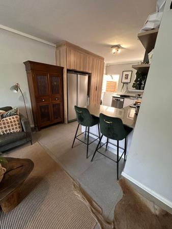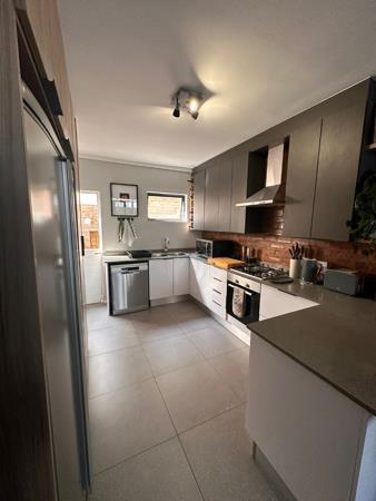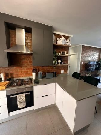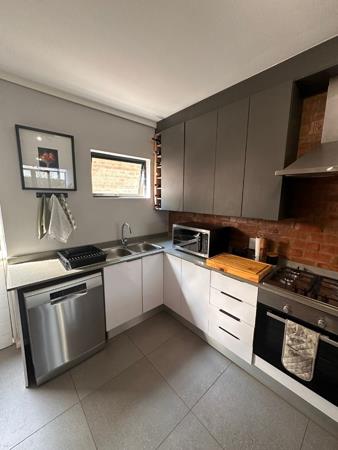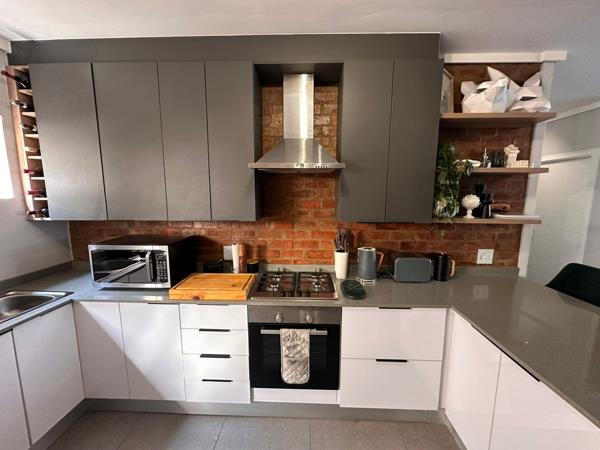 Discover an exquisite rental opportunity in the highly sought-after suburban enclave of Menlo Park, Pretoria. This sophisticated 88 sqm residence, nestled within a tranquil complex on a cul-de-sac, offers a lifestyle of unparalleled comfort and modern elegance. The meticulously furnished interior boasts an open-concept living and dining area, seamlessly flowing into a contemporary kitchen. Adorned with striking exposed brick accent walls and a chic modern barn door, the space exudes an industrial-rustic charm. The L-shaped kitchen is a culinary delight, featuring sleek grey upper and white lower cabinetry, dark countertops, an exposed brick backsplash, and integrated appliances including a gas hob, oven, dishwasher, and a built-in wine rack.