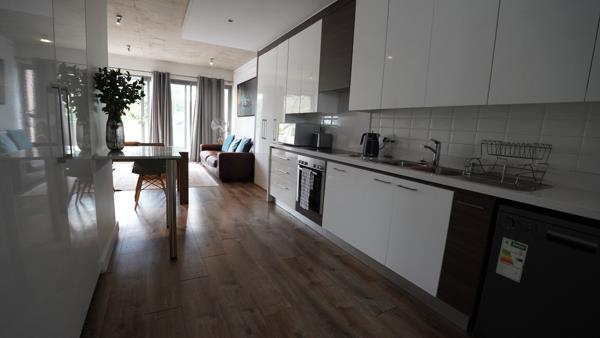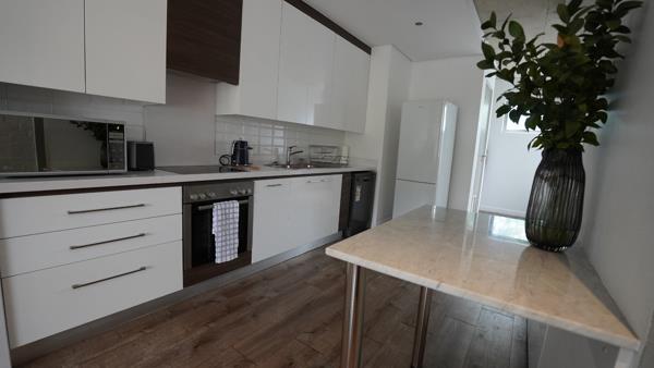 The modern kitchen includes quality appliances such as a dishwasher, microwave, and fridge, with plenty of storage and counter space. A neatly concealed laundry area offers a washing machine, tumble dryer, ironing board, and iron for added convenience.