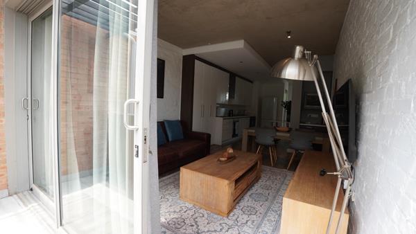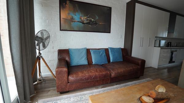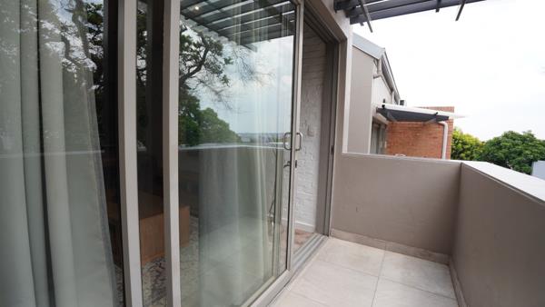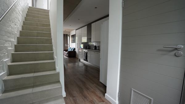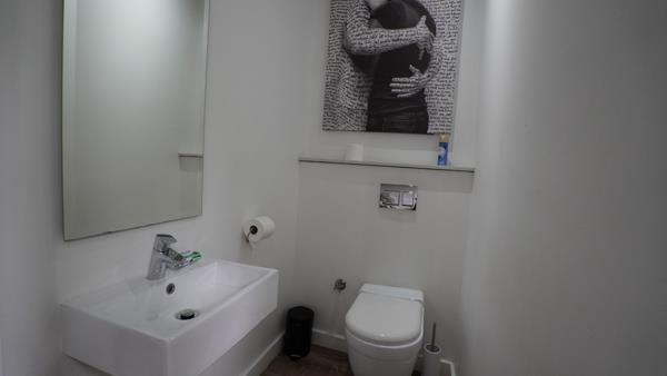 The apartment features two well-sized bedrooms with ample cupboard space and two stylish bathrooms, each with an en-suite shower and a shared toilet on the upper level. A convenient guest toilet is located downstairs.