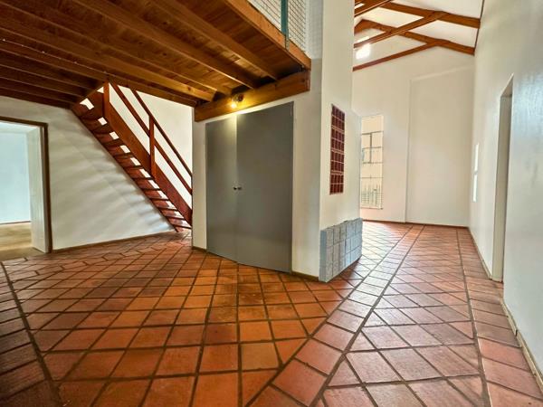 Discover this charming 110 sqm rental property located in the desirable suburban area of Menlo Park, Pretoria. This unique home offers a distinctive blend of rustic character and comfortable living, featuring two spacious bedrooms, each complemented by its own en-suite bathroom. The expansive living area boasts impressive high vaulted ceilings with exposed wooden beams, creating an airy and inviting atmosphere. Durable terracotta tile flooring flows throughout, adding to the home''s warm aesthetic, while a prominent fireplace serves as a focal point, perfect for cooler evenings.