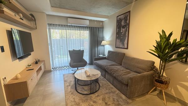 Discover modern living in this stylish 2-bedroom, 2-bathroom apartment located within a secure estate in Waterkloof Park, Pretoria. Spanning 120 square metres, this residence offers a contemporary open-plan layout, seamlessly integrating the lounge, dining area, and a well-appointed kitchen. The kitchen boasts sleek wooden cabinetry, clean countertops, and a full suite of integrated appliances, including a washing machine, refrigerator, stove, oven, microwave, and dishwasher, ensuring convenience and a cohesive aesthetic. The living spaces are enhanced by air conditioning, track lighting, and sliding doors that open to a private patio with a built-in braai, perfect for outdoor entertaining and enjoying the garden.