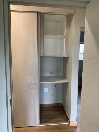 The open-plan kitchen, dining, and living area create a welcoming space for entertaining guests or simply unwinding in comfort. A laundry cupboard in the passage provides space for a washing machine, while the single garage with direct access into the unit ensures both convenience and security.