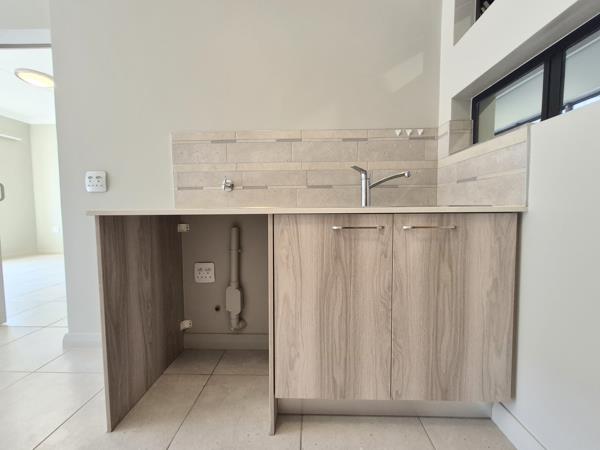 The kitchen has a stove, oven, and space for a washing machine and fridge