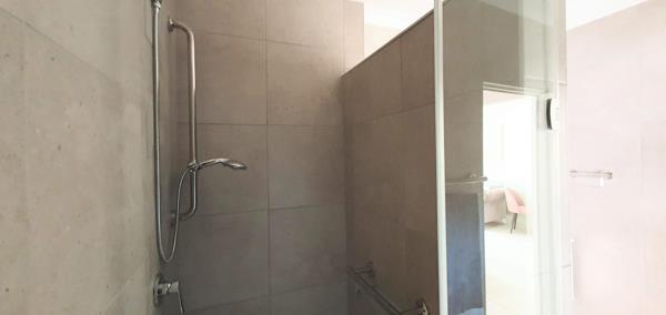 The bathroom is en-suite, wheelchair friendly, with a wide shower, toilet, and a wash basin