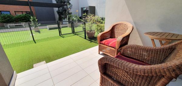 The apartment features a private garden with low-maintenance artificial grass, creating an extended patio area for outdoor living and entertainment.