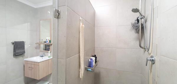 The bathroom is en-suite, wheelchair friendly, with a wide shower, toilet, and a wash basin