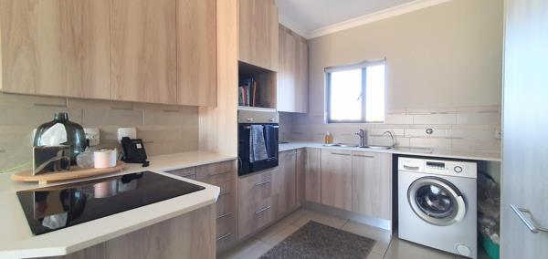 The kitchen boasts plentiful cupboards and has space and connections for a washing machine, dishwasher, and a single-door fridge. It features a beautiful Quartz countertop, as well as a stovetop and oven.