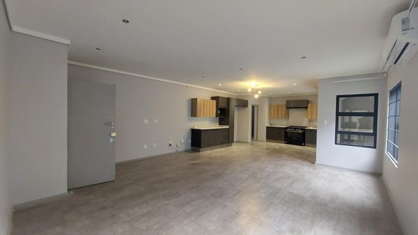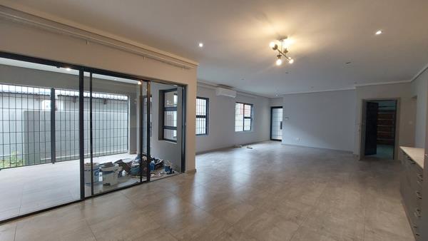Open plan lounge features neatly tiled floors, newly painted walls, an aircon and with an entrance from the front of the erf.