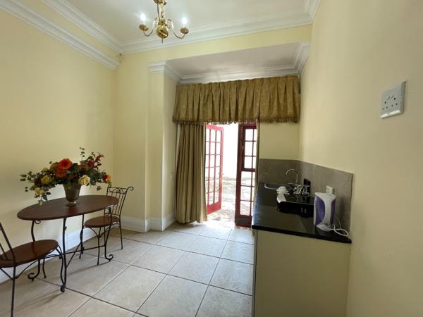 Discover this inviting 1-bedroom, 1-bathroom rental unit within a secure gated community in Pretoria''s prestigious Waterkloof suburb. Ideal for a single professional or couple, this dual living opportunity offers a compact yet functional layout. The unit features a comfortable lounge and a practical kitchenette, perfect for everyday living. Interiors boast elegant tiled flooring, crown molding, and classic chandeliers, creating a refined atmosphere. The bedroom includes an ensuite bathroom and a unique arched niche, with double doors providing direct outdoor access.
