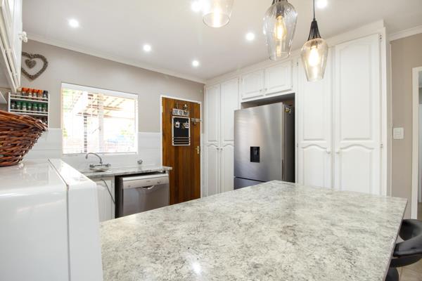 The open-plan tiled living area consists of a kitchen, living room and dining room. The kitchen is fitted with granite countertops, a dishwasher connection and ample cupboard space. An outside laundry room is equipped with water, electricity and all the necessary connections for appliances. The well-maintained garden offers a sparkling swimming pool and upgraded garden, ideal for relaxed outdoor living.