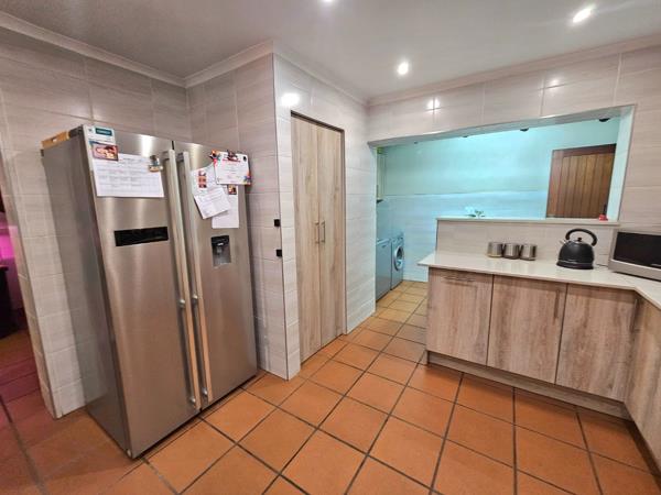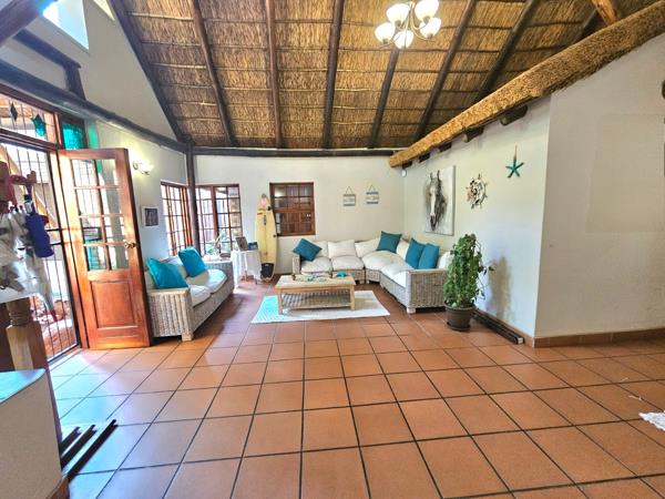 Adding to its unique appeal, the property showcases a charming thatched roof, creating a warm and inviting atmosphere. This exceptional home combines character, comfort, and versatile outdoor living, making it an ideal rental opportunity for those seeking space, style, and a relaxed lifestyle. The interior features two generous lounges and a dedicated dining room, all benefiting from abundant natural light and durable terracotta tiled flooring. A prominent fireplace creates a focal point in one of the living areas. The modern kitchen is well-appointed with light wood-look cabinetry, white countertops, a built-in oven, gas hob, and space for a double-door fridge. It includes a convenient pantry and an adjacent scullerylaundry area, accessible via a pass-through window, ensuring practical living.
