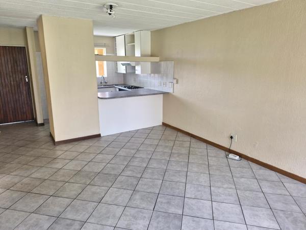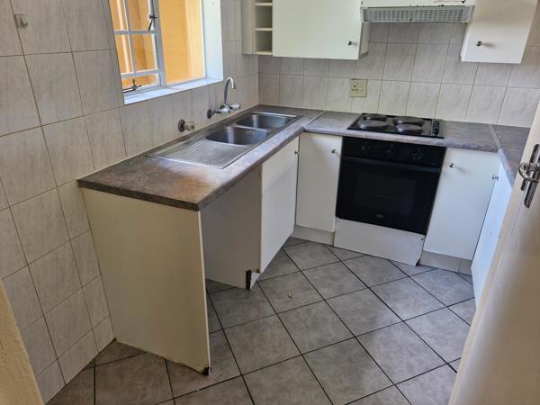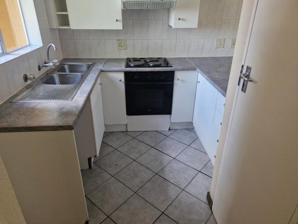 Open plan kitchen with sufficient cupboard space. There is space for 1 front loader washing machine and 1 single door