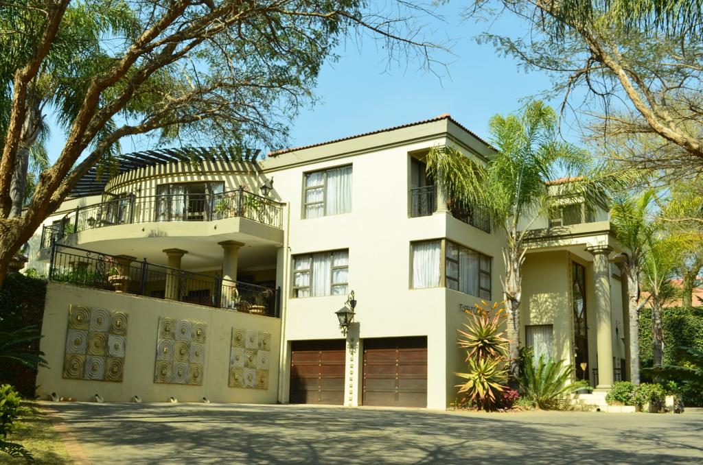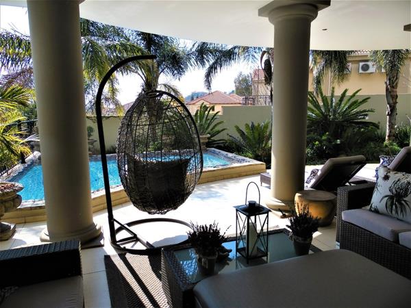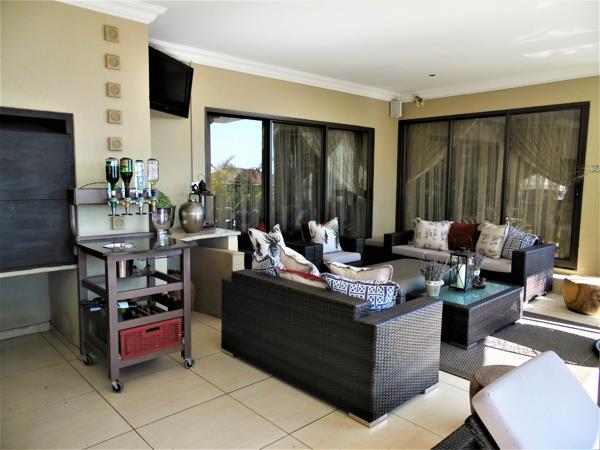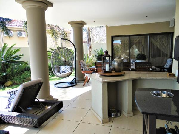 You are welcomed by a grand entrance hall, where the red Persian carpet is literally rolled out on the stairs. The open-plan, tiled, living areas include the formal lounge, the family lounge with a fireplace, and a spacious dining room. The dining room and family room open out to an under-covered patio with a built-in braai and a bar area, making this home ideal for the family that enjoys entertaining family and friends. This area also overlooks the heated swimming pool and luscious garden.