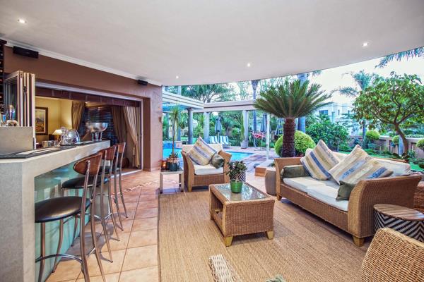by a charming bar, creating the perfect space to entertain guests or enjoy a quiet evening with loved ones. The patio overlooks the stunning garden and sparkling swimming pool, offering