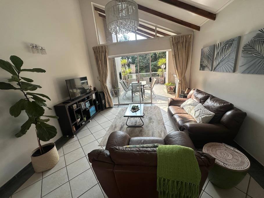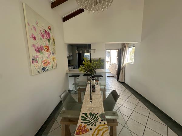The kitchen boasts elegant white countertops and cabinetry, complemented by a cozy breakfast nook the perfect spot to ease into your morning coffee ritual. Designed with easy living in mind, the open-plan layout flows seamlessly into the dining area, which sits just across from the spacious TV lounge. Striking high ceilings and exposed wooden trusses lend the home a relaxed, coastal ambiance. The lounge extends onto a generous balcony fitted with a built-in braai, all set against the breathtaking backdrop of the golf course fairway.