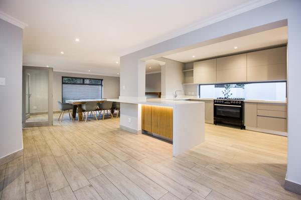 A Sophisticated Open-Plan Kitchen with seamless designer finishes, and a spacious scullery flowing into the dining area and TV lounge for connected, easy living