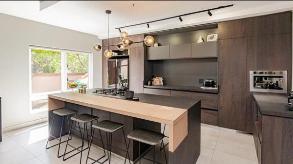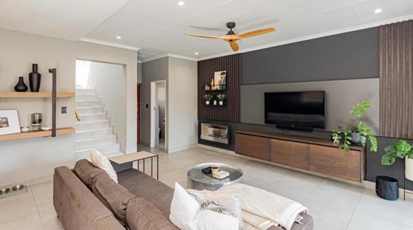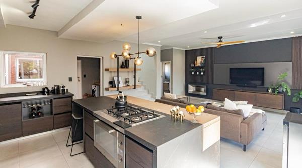This contemporary furnished rental property offers a sophisticated lifestyle within the esteemed Woodhill Golf Estate, Pretoria. The heart of the home features an inviting open-plan living and kitchen area, designed for seamless entertaining and daily comfort. The modern kitchen boasts sleek dark wood cabinetry, a spacious island with an integrated gas hob and breakfast bar, and ample storage including a wine rack. The lounge area is enhanced by a stylish accent wall and a contemporary linear fireplace, creating a warm ambiance.