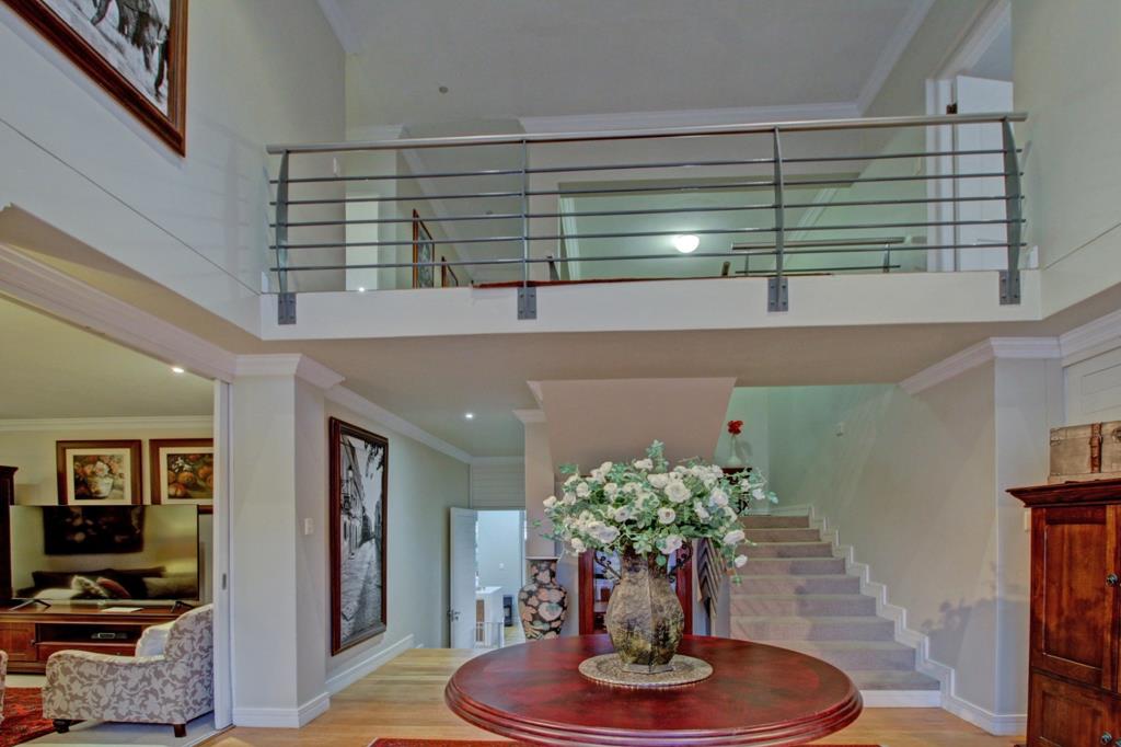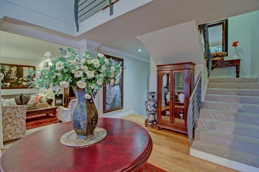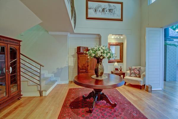 Situated within a secure golf estate, residents benefit from peace of mind. This home is also equipped with modern sustainability features, including solar panels and a battery inverter for energy efficiency, alongside water tanks and an irrigation system to maintain the beautiful garden. A dedicated study provides a quiet space for work or contemplation, while four garages offer secure parking and additional storage.
