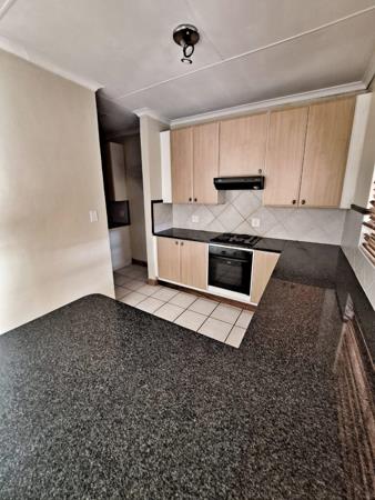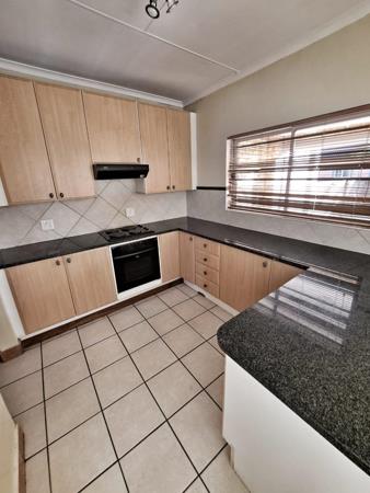 Spacious 3 bedroom, 2 full bathrooms main en-suite, guest toilet, open plan dining and lounge area with a glass sliding door that opens-up to a patio with a built-in braai and a small manageable garden that is pet friendly for 2 small breed dogs or 1 medium size breed dog no cats allowed, kitchen with seperate wash-up area, double garage with 1 visitor parking, pre-paid electricity.