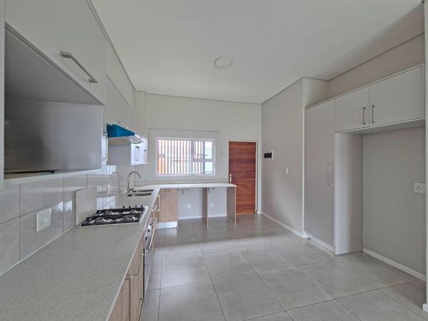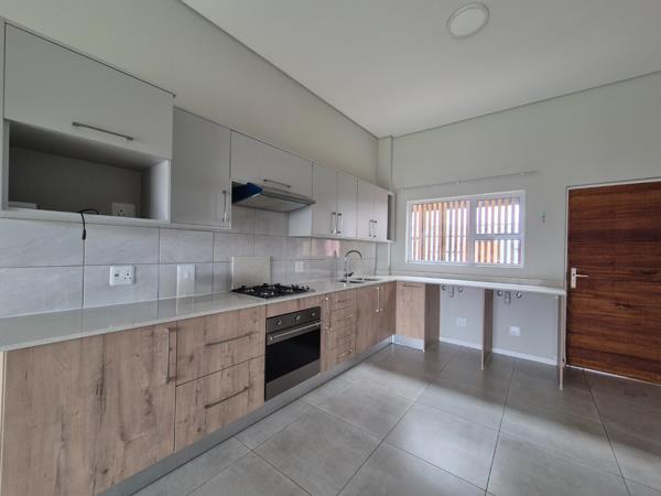 Discover modern living in this stylish 2-bedroom, 2-bathroom first-floor apartment located within a secure complex, Doringbome Lifestyle Estate in Equestria, Pretoria. This contemporary unit boasts an open-plan layout, seamlessly connecting the lounge and a state-of-the-art kitchen. The kitchen is a highlight, featuring sleek light grey and wood-look cabinetry, speckled white countertops, a gas hob, built-in oven, extractor fan, double sink, and an integrated wine rack, perfect for culinary enthusiasts. Tiled flooring extends throughout the living areas, ensuring a clean and low-maintenance environment.