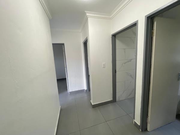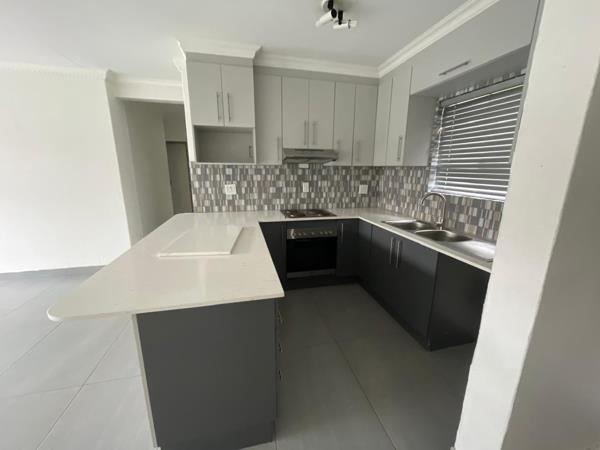 Experience contemporary living in this inviting 3-bedroom, 1-bathroom rental property, nestled within a secure gated community in La Montagne, Pretoria. The home presents a modern open-plan layout, where the lounge seamlessly flows into a stylish kitchen. This central area features sleek grey tiled flooring and fresh white walls, creating a bright and versatile atmosphere. The kitchen is a focal point, boasting elegant two-tone cabinetry, pristine white quartz-like countertops, a chic mosaic tiled backsplash, and a large island/breakfast bar. Integrated hob, oven, and a double sink enhance its functionality, complemented by a dedicated pantry. The three comfortable bedrooms maintain the modern aesthetic with grey tiled flooring and neutral palettes, benefiting from ample natural light and security bars on some windows.