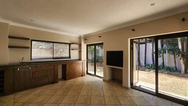 The living area flows effortlessly to the covered outdoor entertainment area complete with a built-in bar and built-in braai ideal for hosting friends and family all year round. The spacious garden offers plenty of room for kids and pets to play, making it a perfect fit for family living.