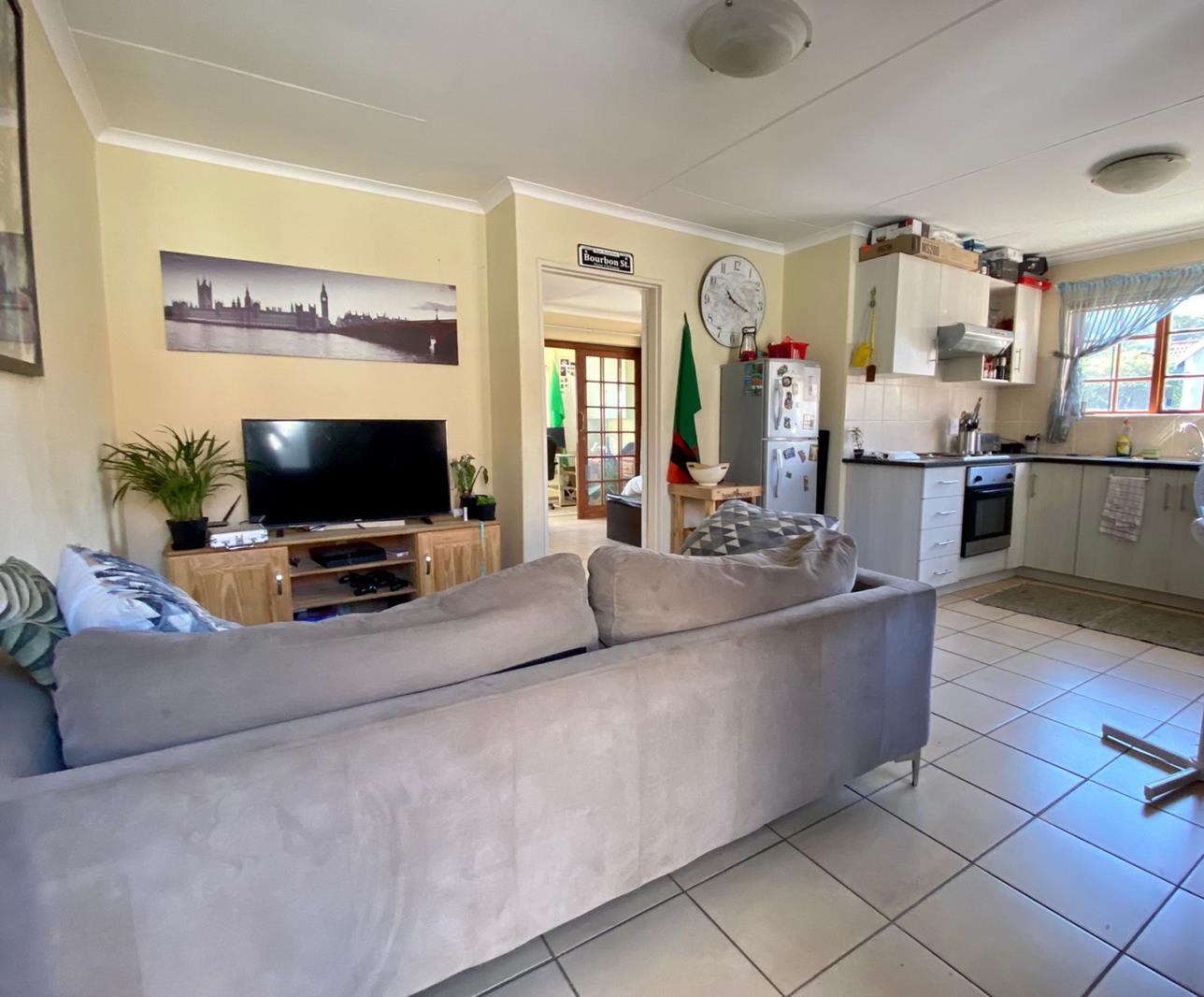 The kitchen opens into a living area with ample natural light.
