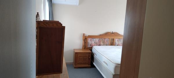Both bedrooms are designed for relaxation, featuring neutral walls and comfortable carpeting. One bedroom includes a practical built-in wardrobe, offering essential storage. The single bathroom is neatly tiled and equipped with a pedestal sink, a bathtub with a shower hose, and a toilet, ensuring functionality and ease of use.