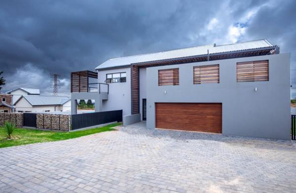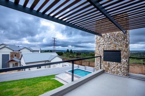 Upon entering the home the majority of the ground floor consists of double volume open spaces. A large family lounge with glass stacking doors open out to a covered patio with built in braai. A further second patio is adjacent to the Olympic sized swimming pool and overlooks the Brongberg Mountains.