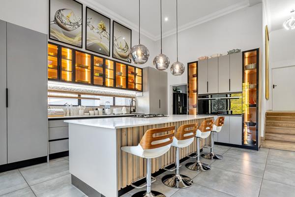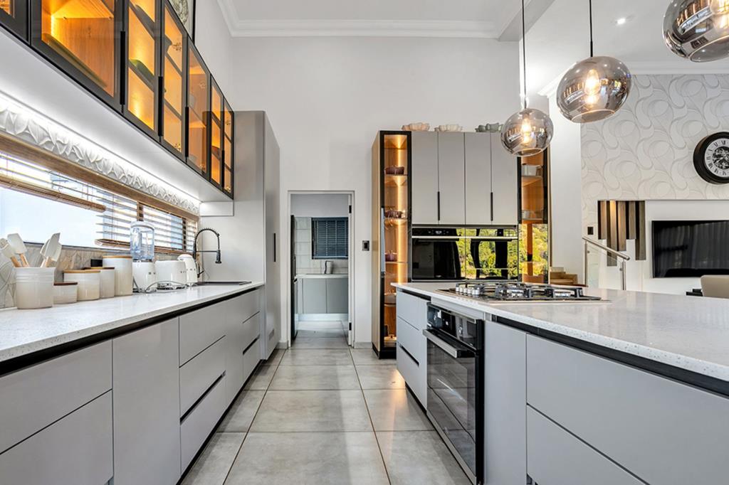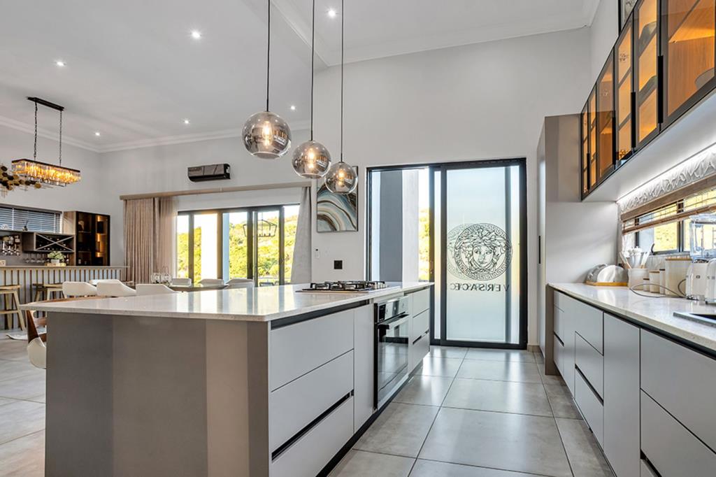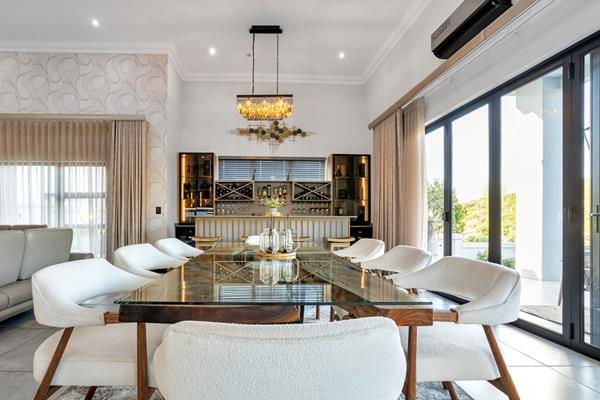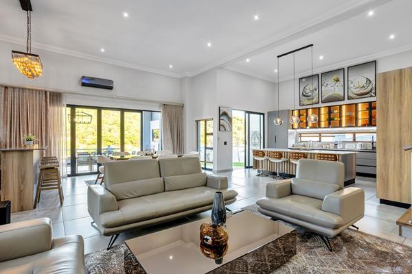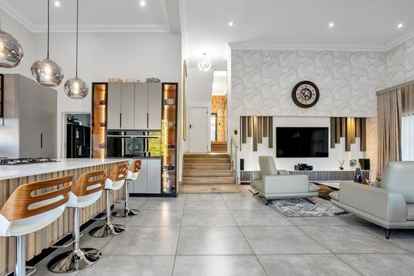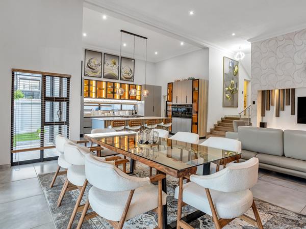 Step through the grand entrance hall, complete with a stylish waiting area, and be welcomed into a home where every detail reflects quality and contemporary design. The modern open-plan kitchen is a chefs delight, featuring high-end finishes, an integrated fridge, a walk-in pantry, and a convenient scullery. The kitchen flows effortlessly into the dining and familyTV rooms, both fitted with air conditioning for year-round comfort.