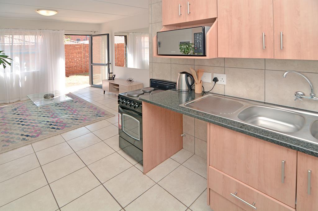 Modern kitchen with built-in cupboards. fully tiled floor.