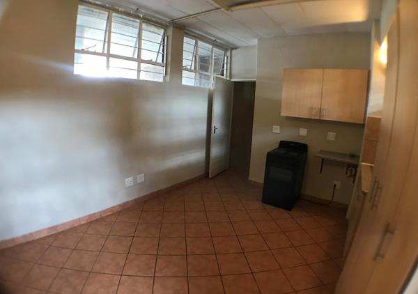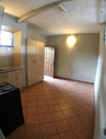 Bachelor apartment available for rent, featuring an open-plan kitchen, bedroom, and lounge area.