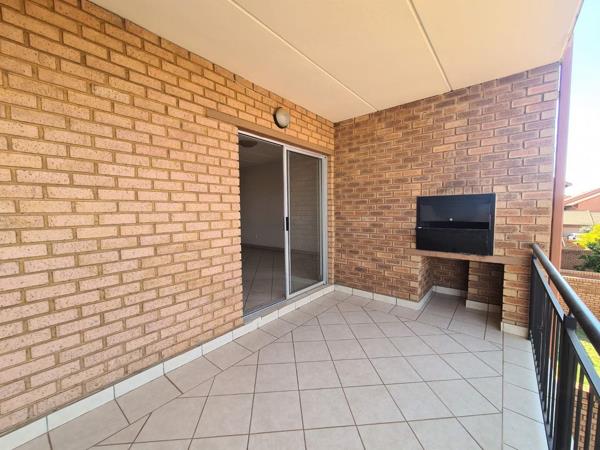 A spacious living room lounge with sliding door that leads onto a covered balcony that as a built-in-braai.