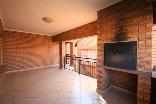 Spacious living room lounge with security gate that leads onto a large covered patio that as a built-in-braai.