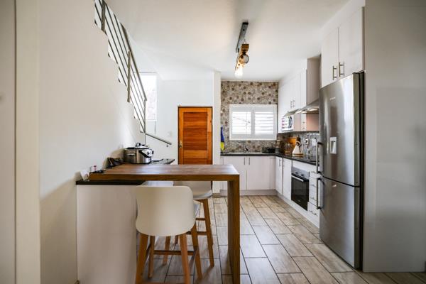At the heart of the home is a sleek, contemporary kitchen fitted with a Bosch ceramic stove and oven, complemented by high-quality cupboards that offer ample storage and a sophisticated aesthetic. The open-plan layout flows seamlessly into the living and dining areas, creating a welcoming space for entertaining and everyday living.